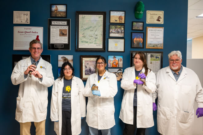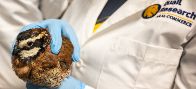 Since 50 to 80% of adult quail die each year, and a quail’s lifespan is only about 6 months, quail populations hinge on sustained quail chick production — development, hatching, and recruitment. The center’s Quail Research Laboratory is able to recreate field conditions in the lab to develop solutions for chick production in adverse conditions.