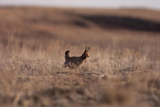 Dragging wings on either side of their bodies, male lesser prairie chickens inflate reddish-orange sacs on the sides of their necks, raise a pair of specialized feathers above their heads, stamp their feet and call, all in the hopes of attracting a female. The males maneuver for position, bobbing their heads at one another and fluttering briefly into the air before starting the routine all over again.