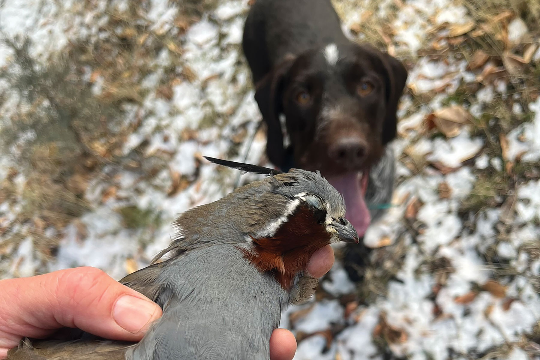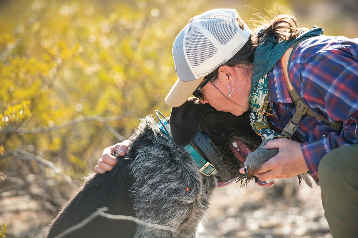 Walking south, we were heading back to the truck when my watch alerted of Gravy’s stillness. Turning back, my friend Stephanie and I found him, shoulders rolled up, crouched in monsoon-loosened stones. The crunch of our boots drove a half-dozen birds from cover. I miss the first, connect with the second.